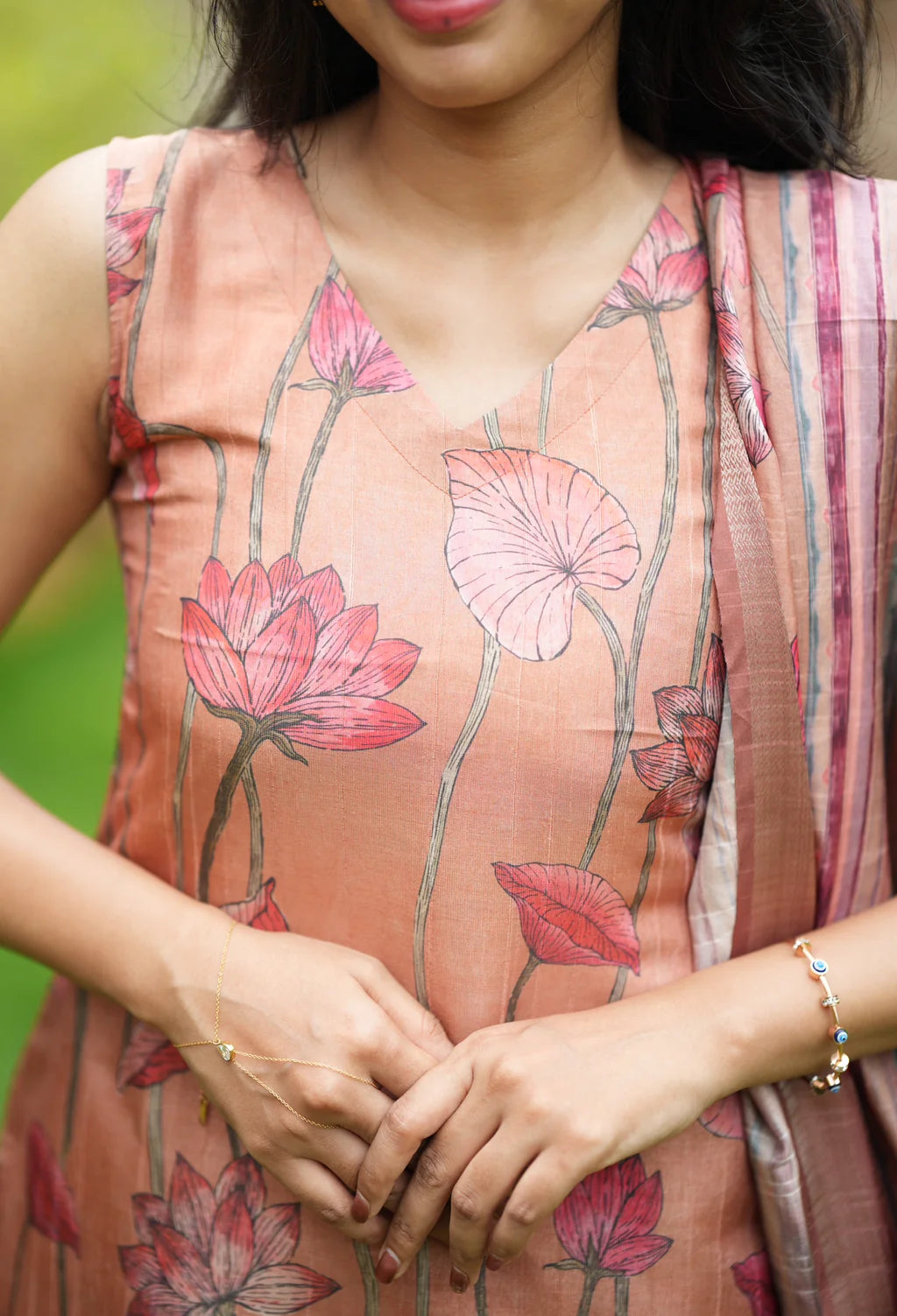 Suit comes with a tussar kurti with a floral print paired with solid bottom and and semi tussar dupatta