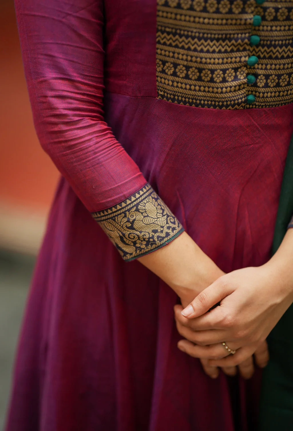 Elephant border design woven reference handloom Anarkali kurti with a striking temple big border and attached cotton lining