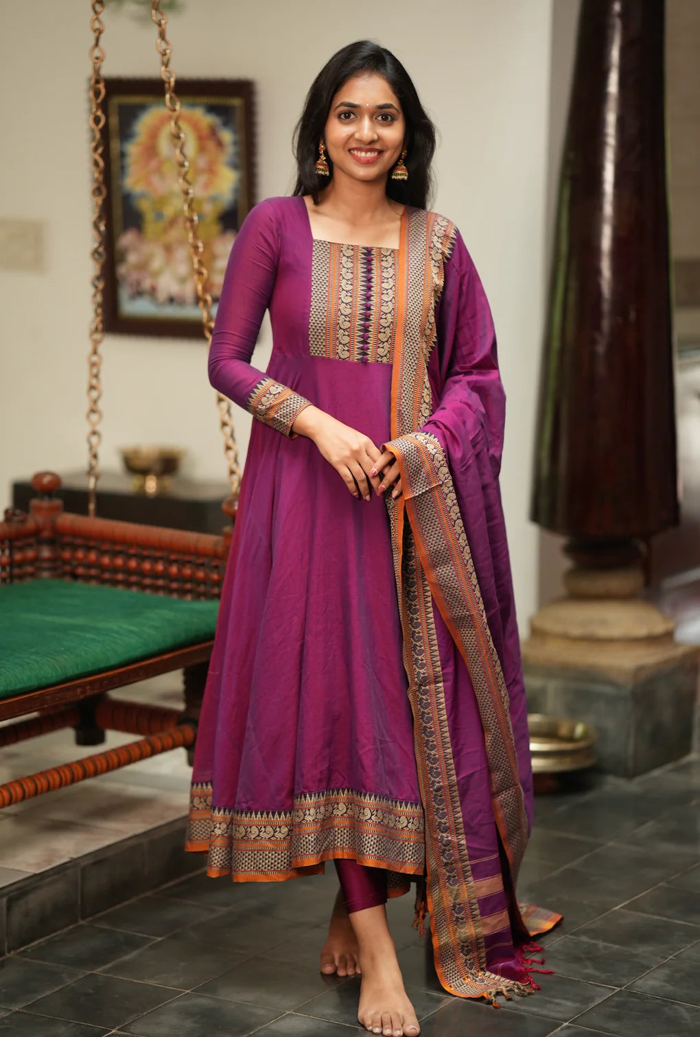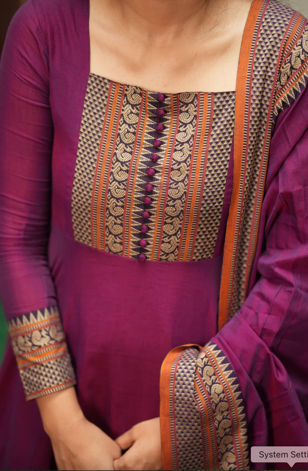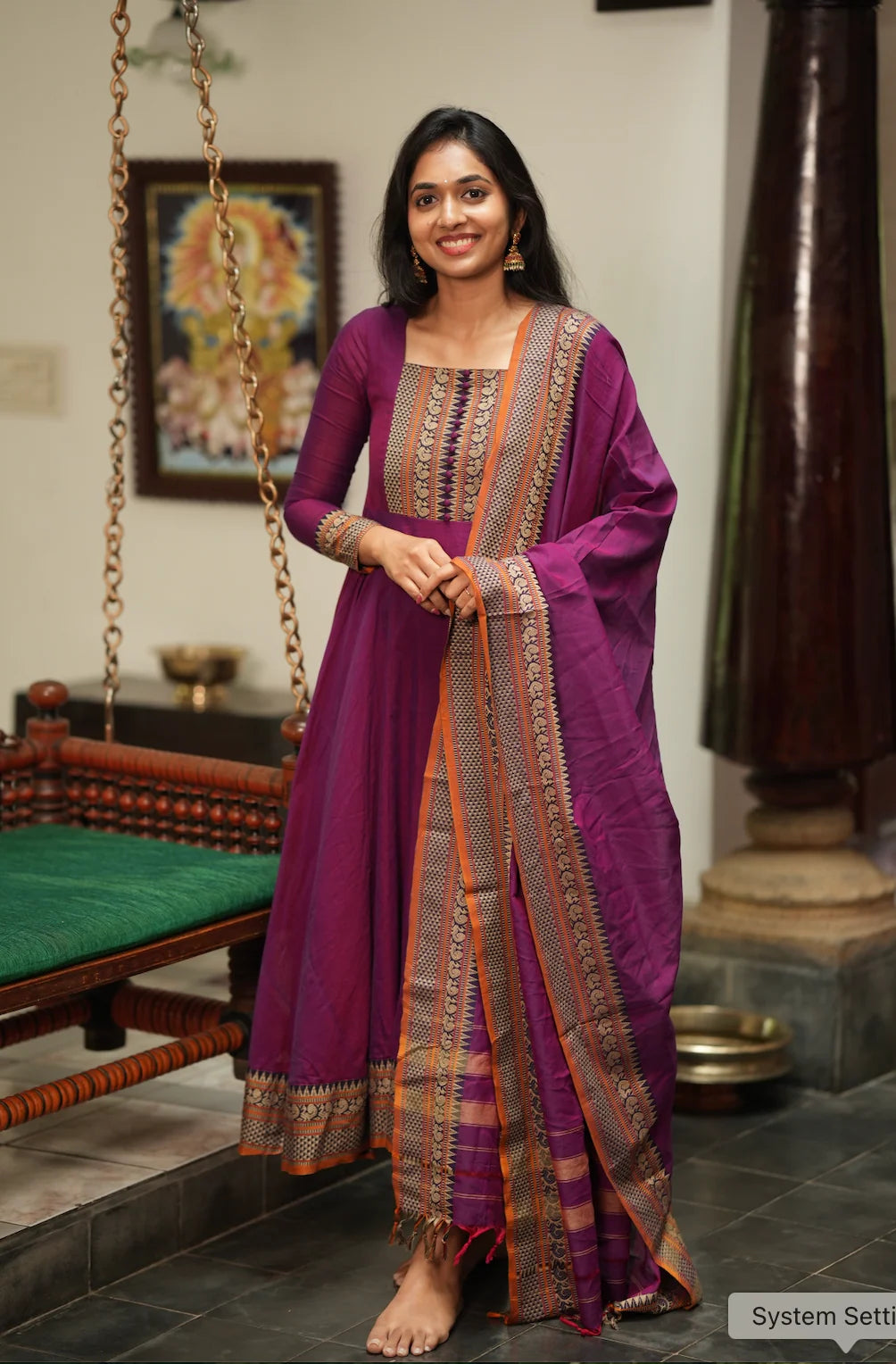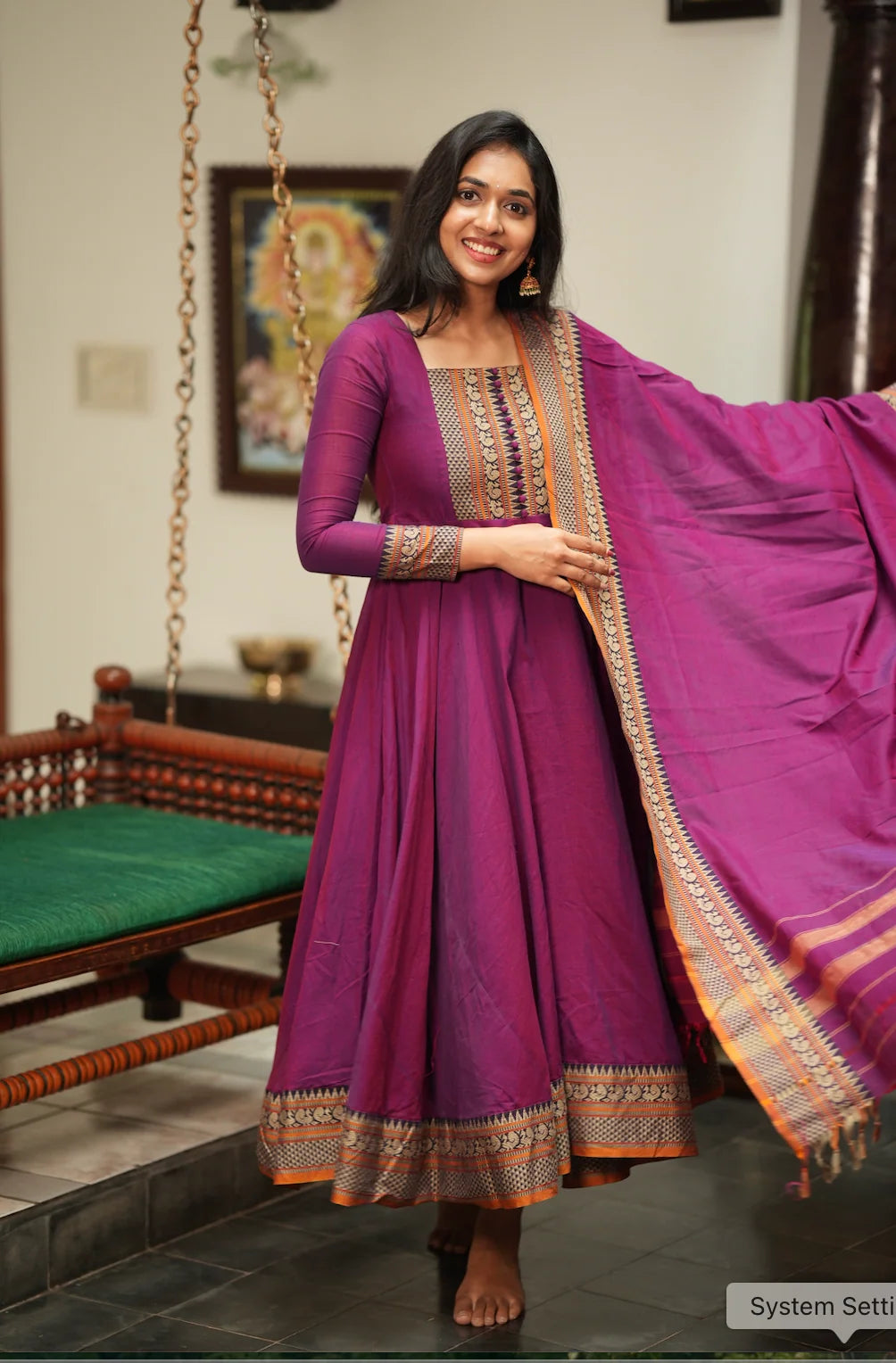 Temple border design woven reference handloom Anarkali kurti with a striking temple big border and attached cotton lining